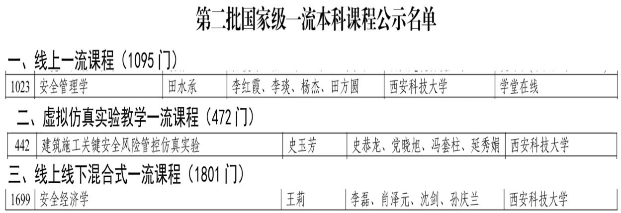 根据《教育部关于一流本科课程建设的实施意见》(教高〔2019〕8号)和《教育部办公厅关于开展第二批国家级一流本科课程认定工作的通知》(教高厅函〔2021〕13号)的有关要求,经个人申报,学院、学校、省教育厅层层审批,教育部组织网络评审和会议评审,2023年4月11日,教育部发布了《关于第二批国家级一流本科课程认定结果的公示》,其中公司教师主持的《建筑施工关键安全风险管控仿真实验》(课程负责人史玉芳,课程组成员史恭龙、党晓旭、冯套柱、延秀娟)获批虚拟仿真实验教学一流课程,参与的《安全管理学》(课程组成员李红霞、李琰、田方圆)获批线上一流课程,参与的《安全经济学》(课程组成员沈剑、孙庆兰)获批线上线下混合式一流课程。