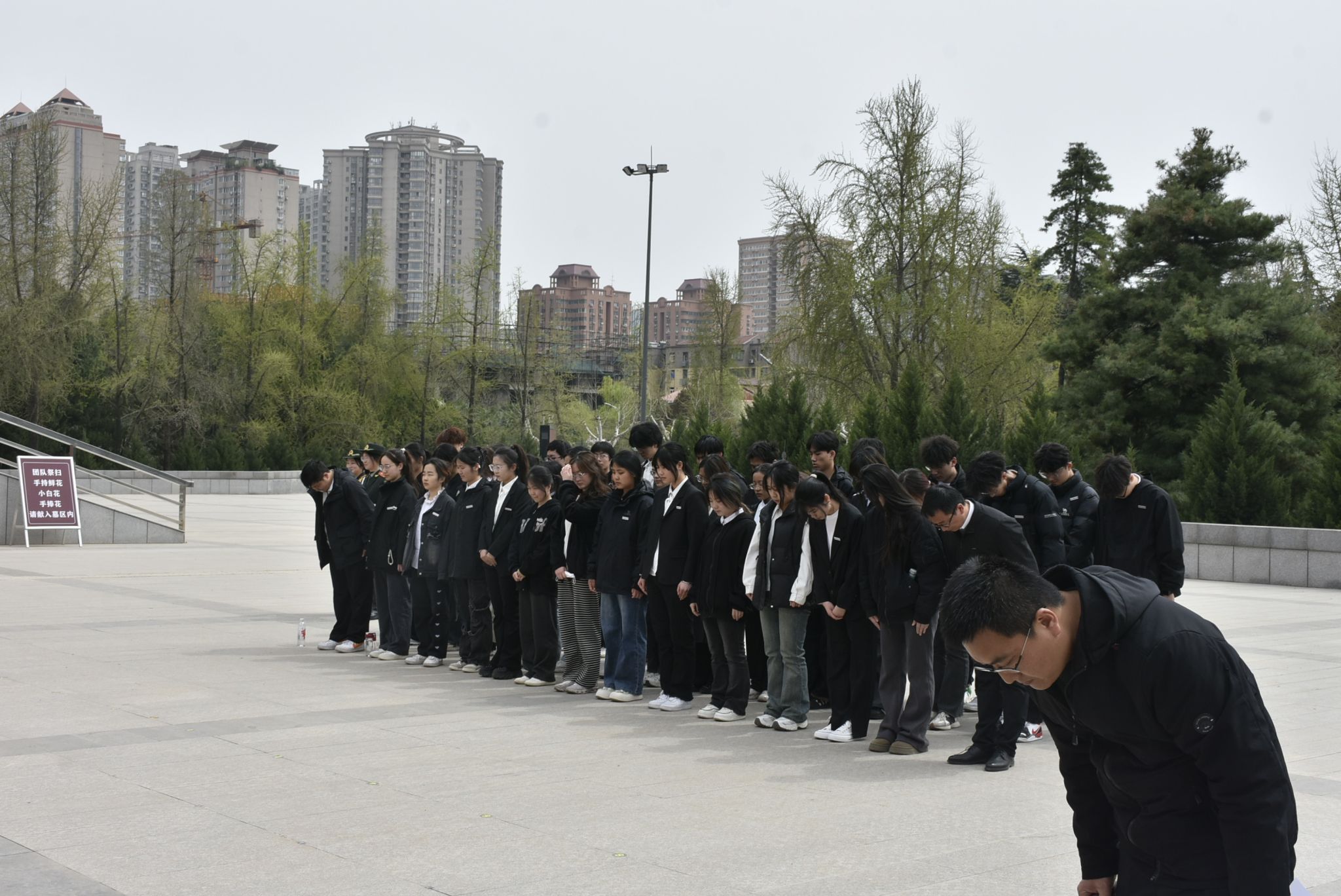 花篮敬献完毕,全体师生鞠躬默哀三分钟。在这寂静的三分钟里,时间仿佛凝固,大家在心中默默缅怀为国家独立、民族解放英勇献身的革命先烈。此时,微风轻拂,仿佛在诉说着先烈们的英勇事迹,让人愈发感受到今天的和平与幸福来之不易。