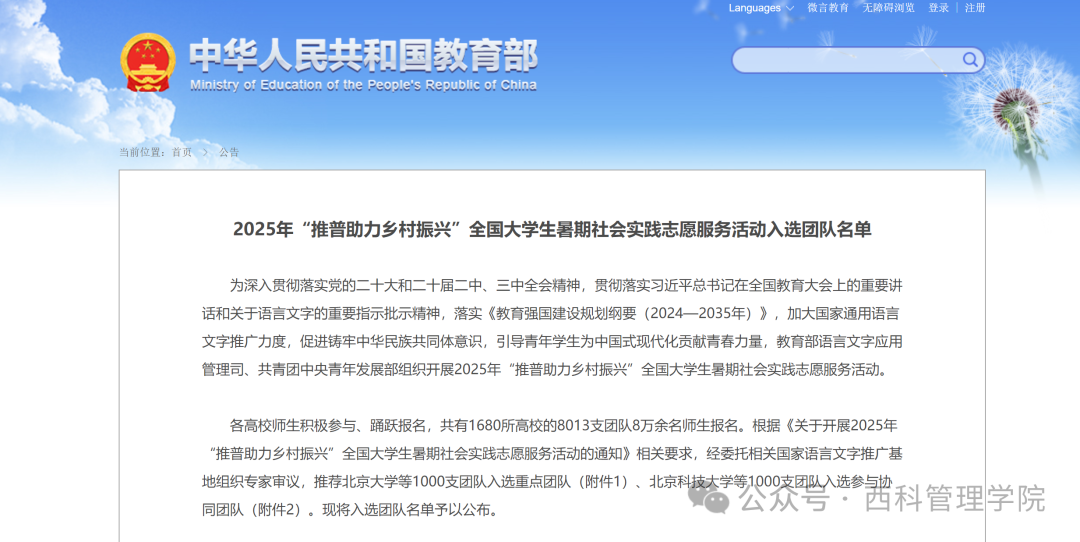 近日,教育部网站公布2025年“推普助力乡村振兴”全国老员工暑期社会实践志愿服务活动入选团队名单。在全国1680所高校8013支团队的激烈竞争中,仅有1000支重点团队和1000支参与协同团队脱颖而出。威廉希尔williamhill“西科推普进秦巴,语通安康润万家”社会实践队凭借扎实的前期筹备与创新实践方案,成功跻身全国重点团队行列。