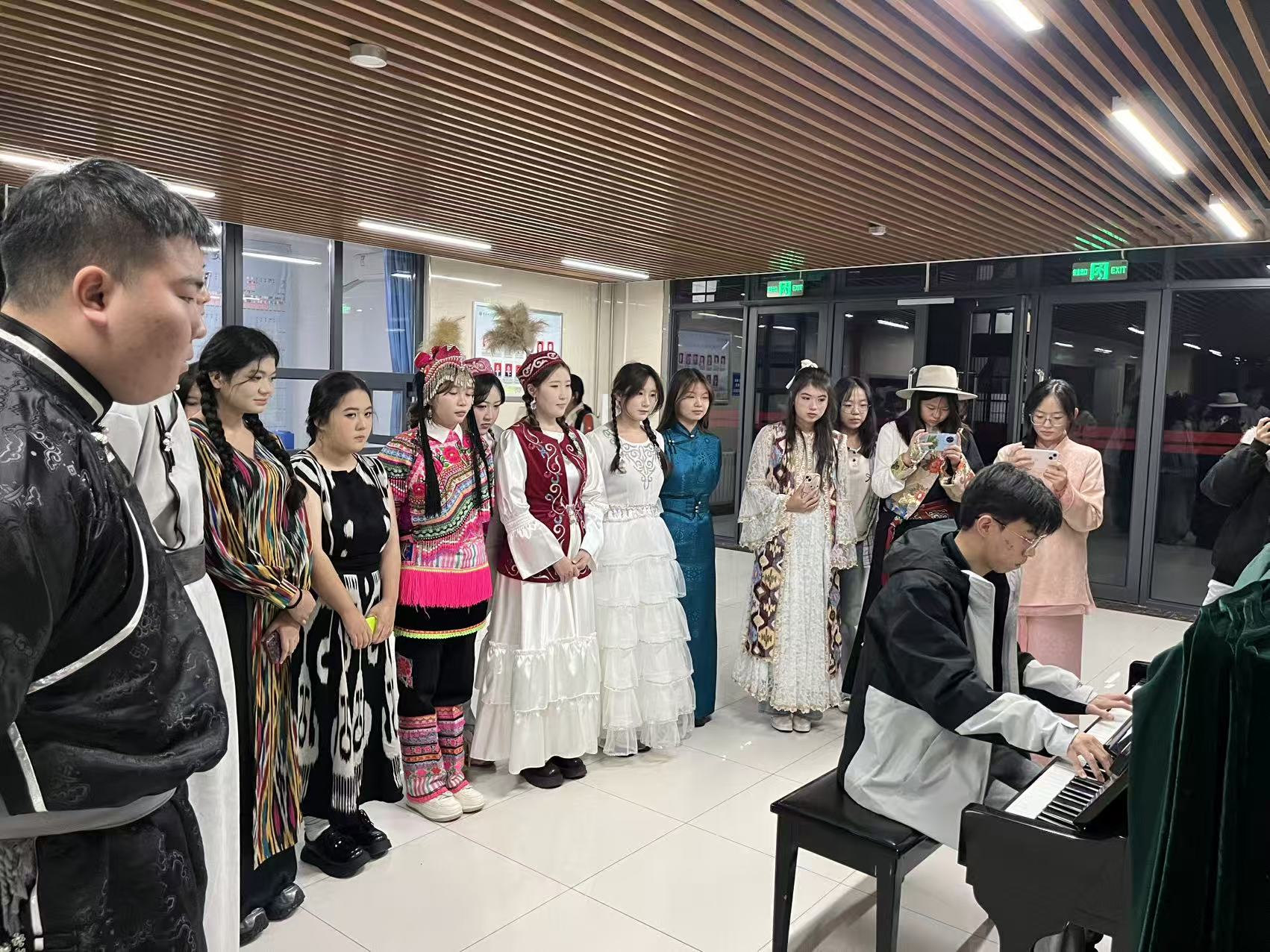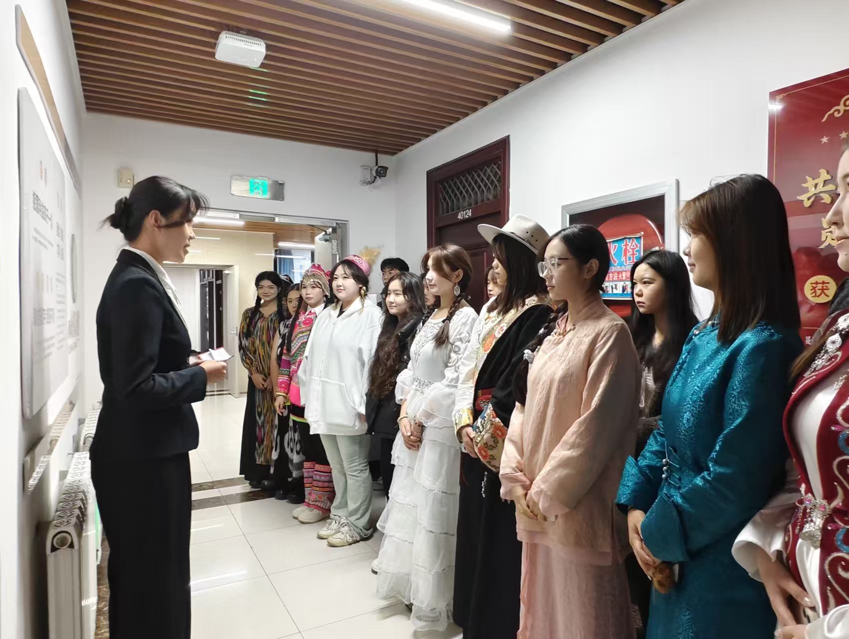 为促进各民族员工交往交流交融,学院创新形式,举办了“校史长廊传薪火,民族艺韵展风华”主题教育活动。同学们在讲解员引导下参观了“一站式”员工社区的校史文化墙,从学校发展历程中感悟与时代同行的奋斗精神。随后的文化交流环节精彩纷呈,各民族员工化身“文化使者”,通过展示艾德莱斯绸、蒙古袍、藏装等特色服饰及其文化内涵,并辅以蒙古族乐器演奏、哈萨克族弹唱、钢琴演绎民族音乐等多元艺术形式,展现了中华文化的绚丽多彩与深厚底蕴。活动现场气氛热烈,欢声笑语不断,“各民族像石榴籽一样紧紧抱在一起”的生动画面深入人心,有效增强了员工的文化认同与民族情感。